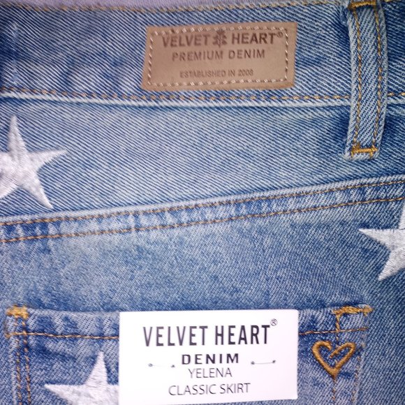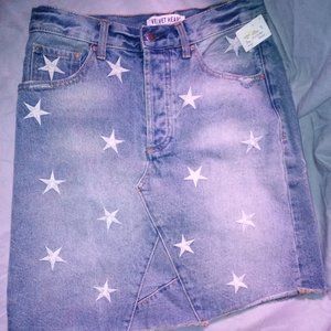 New with Tags. Size 28. Velvet Heart Denim skirt with white stars stitched in.