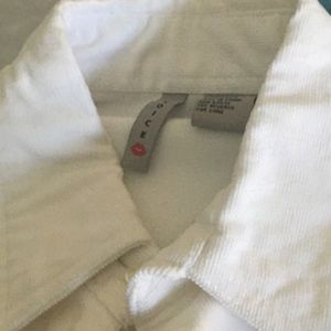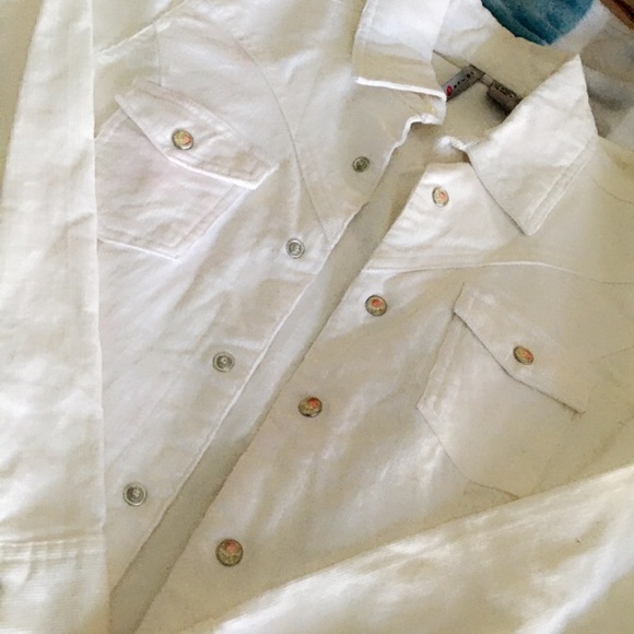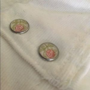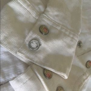 Soft fuzzy material. All white with rose detailing in the buttons. One button is missing on the right hand sleeve.