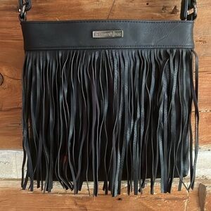 Stylish black crossbody bag with fringe detailing. Perfect for adding a chic touch to any outfit.