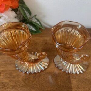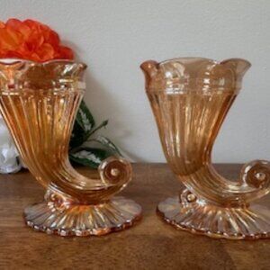 Jeanette Glass Marigold Carnival Glass Horn of Plenty Vases Pair Cornucopia Fall