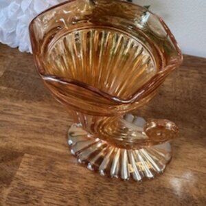 Classic cornucopia shape in glowing marigold carnival glass – a festive and symbolic mid-century design by Jeannette Glass.