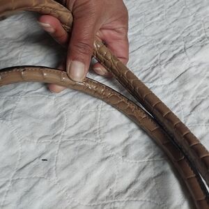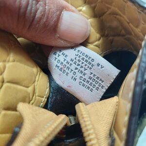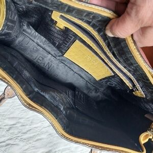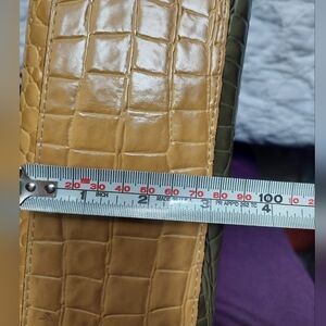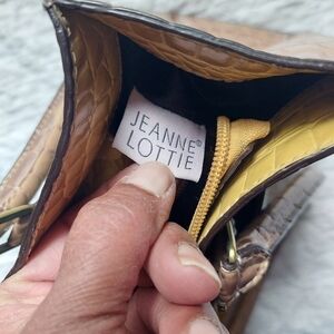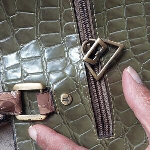 Jeanne Lottie 3-Tone Synthetic Alligator Embossed Satchel Bag. Features lovely earth tones of mustard yellow, forest green and tan. Front slit pocket with snap closure. Back zippered pocket. Zippered top closure. Pre-owned. Excellent condition. Shows slight wear on metal (see all photos).