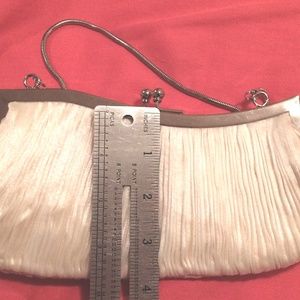Off white satin evening clutch perfect for wedding or any other occasion. It is in great condition but small makeup stains on the inside.