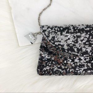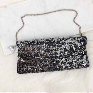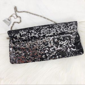 Description: Black and silver sequin clutch. You can comb the sequins with your hand to be more silver or black. Optional chain strap.