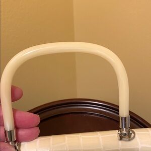 This cream mini bag showcases a luxurious crocodile texture, offering a sophisticated and timeless look. Its compact design includes a detachable shoulder strap, making it versatile for various occasions. The silver-toned hardware adds a touch of elegance to its classic silhouette.
