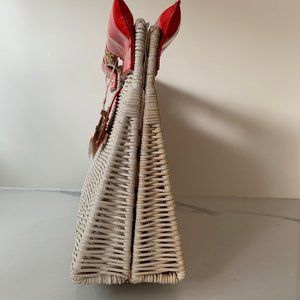 woven straw clutch day handbag with bamboo handles, red vinyl trim and gold-tone hardware