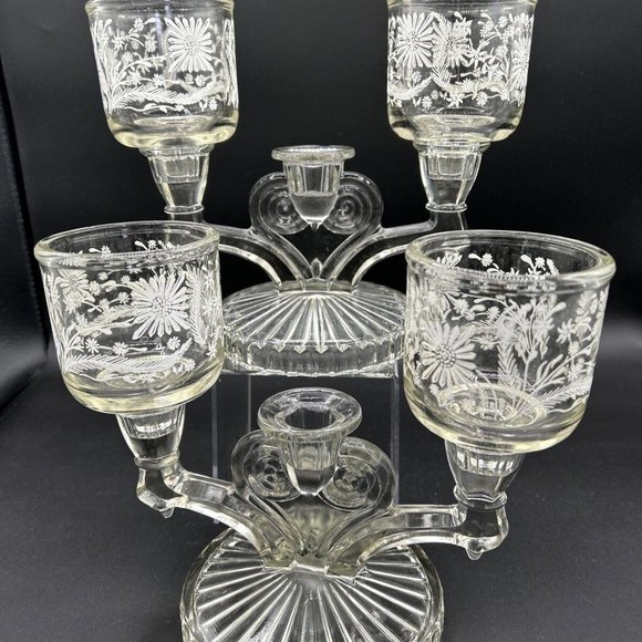 Add a touch of elegance to your home with this beautiful Jeannette Cosmos Candle Triple Candlestick with Votive Holders. This vintage candle holder is made of clear glass and features a beautiful floral pattern that will complement any decor. The candlestick measures 7.5 inches in height and 9.5 inches in width, making it the perfect centerpiece for your dining table or living room.