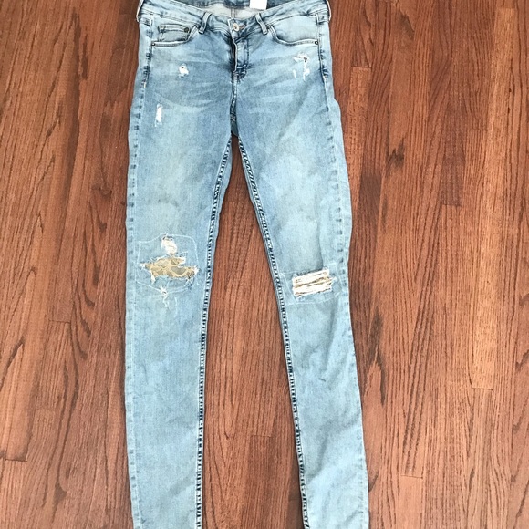 Light washed ripped jeans, cream lace sewn underneath rips