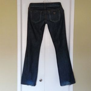 Premium Low-rise tailored flare stretch jeans, Mid Blue tone, Five pocket, Patch back pocket, Made in U. S. A