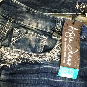 Curvy, slim fit jeans. Brand new, never worn. Lots of detail, good jeans to dress up or down.