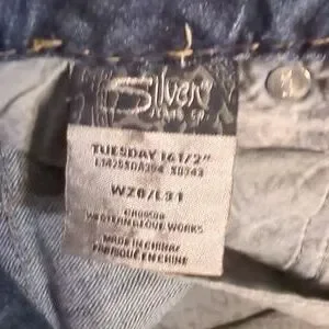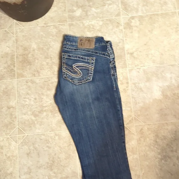 Silver jeans, boot cut, size 28/31. material is 99% cotton, 1% spandex,mid waist fit. wore a few times but now to small.