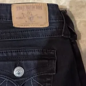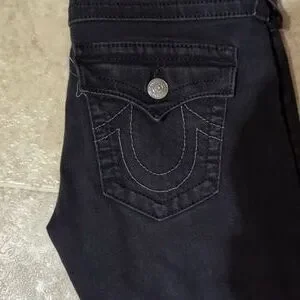 True Religion black skinny jeans, 68% cotton, 28% polyester, 3% elastine, lots of stretch.