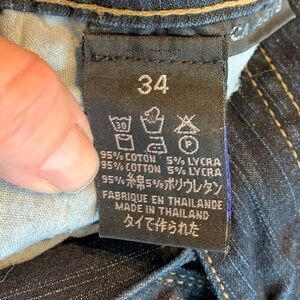 Fabulous look in deep indigo denim. Mid rise stretch jean with sexy sheer black lace inserts from knee to cuff, beautifully enhanced with black iridescent beads that catch the light as you move. Size 34 with approximately 30 In inseam. Lots! of stretch for comfort and body con fit. Vintage, in excellent used condition with no wear, stains, or missing beads detected. Dare to be different, and dazzling, at the club, date night. Perfectly paired with lace Biker influenced jacket ( shown, listed and priced separately in Our Closet, other completing options available) . Build your complete new look, make a bundle, save a bundle, with Lemon Squeezy Shop🍋