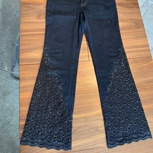 Jeans, Sonic Violet, lace and iridescent beads, stretch, 34W X 30L, boot cut EUC