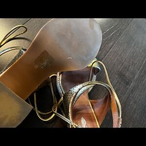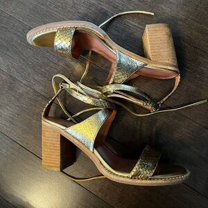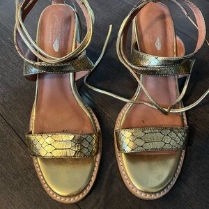 Jeffrey Campbell x Free People gold tie up heeled sandals.
