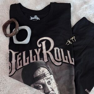 Black graphic t-shirt featuring Jelly Roll design. Includes stylish accessories. 2 resin bangles, gold tone bow earrings. Retail- $105