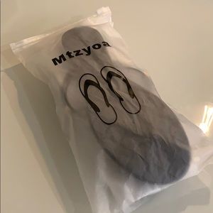 New in package. Black and gold jelly bow and stud flip-flop sandal.