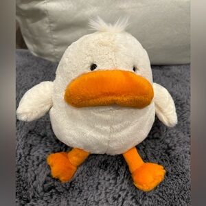 Head down to the pond to find Delia Duck. Super soft in cream fur, Delia has a matching tuft of long hair and short, wide wings. With bright orange feet and a matching sad beak, this grumpy duck prefers cuddles over bread.