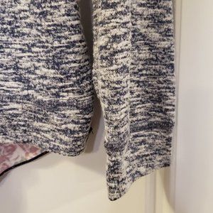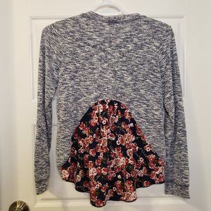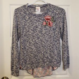 -Lovely long-sleeve crew neck shirt with embroidered burgundy/pink roses decor and pretty blue burgundy/pink rose pie shaped pattern on bottom back