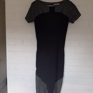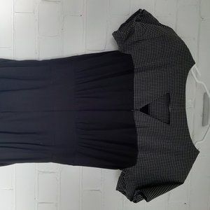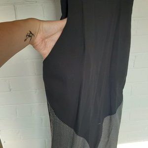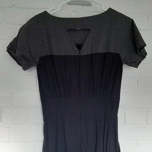The Pushkin is an elegant midi length dress. The dress has a slightly billowy bodice, kimono sleeves, straight skirt with a back pleat, invisible zipper closure and side POCKETS. Like all Jennifer Glasgow pieces it has great details like a lovely black and white check colour block detail and a triangle cutout detail on the back.