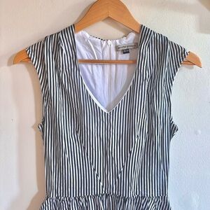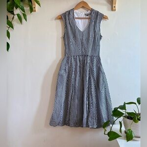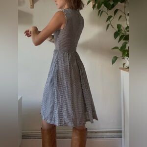 Elegant, timeless, and ethically made. This sleeveless striped midi dress by Jennifer Glasgow, a renowned Canadian designer, features a tailored V-neck bodice, defined waist, and flowing gathered skirt. Fully lined in breathable 100% cotton. Originally retailed for $300+ β a stunning piece of slow fashion.