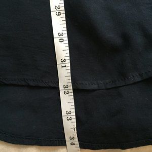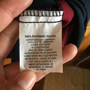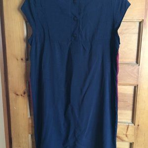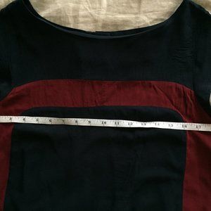 Navy and maroon tunic dress, made in Canada by Jennifer Glasgow. The geometric lines and shape are really flattering, and it has cute buttons in the back. The dress is super light and comfortable, and it shorter in the front than the back (as you can see in the measurement photos). The left sleeve seems has come undone, but it looks like the sleeves are double-stitched, so this has not affected the sleeve's integrity.