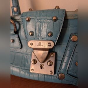 Chic Jennifer Lopez light blue satchel with crocodile texture. Features silver hardware accents. Ideal for stylish outings and a Y2K look.