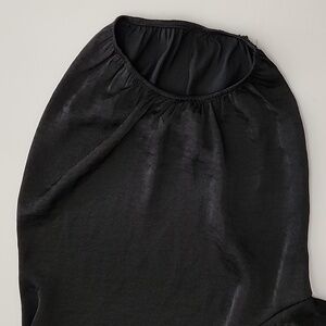 Excellent pre-owned condition, Jennifer Lopez black off the shoulder with fun front knot blouse with 3/4 length sleeves with elasticized cuffs and in a flowy, satiny-like, lightweight fabric, size large.