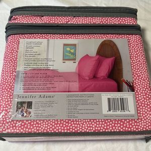 Twin Sheet Set: fitted sheet 39” W x 75” L (fits mattresses from 15” deep), flat sheet 67” W x 97” L, pillow cases 20.5” W x 27” L