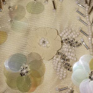 Embroidery consists of 3-D cherry blossoms in both fabric and other materials shown.