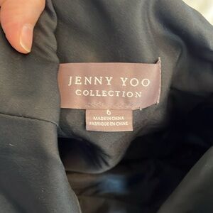 Jenny Yoo Cassie Flutter Sleeve Surplice Gown Black with Floral Pattern.