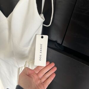 Elegant white wedding dress by Jenny Yoo. Features a fitted bodice and flowing skirt. Perfect for a modern bride.