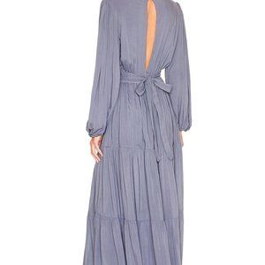 100% rayon. Hand wash. Unlined. Pull-on styling with elastic waistband. Partial front button closure.Wide sleeves with elastic cuffs. Split back with loop button closure and attached tie closure.Jersey fabric with tiered skirt and ruffle hem.