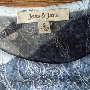 This Jess and Jane women's lightweight blouse features a stunning paisley design in shades of blue and gray.