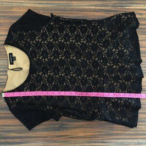 Short-sleeved, layered fit and flare top with lacy black overlayer and nude mesh underlayer. Does up with a single button in the back.