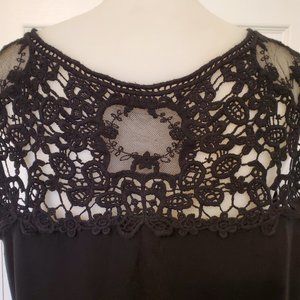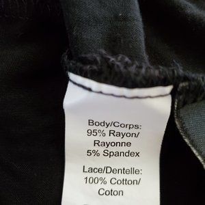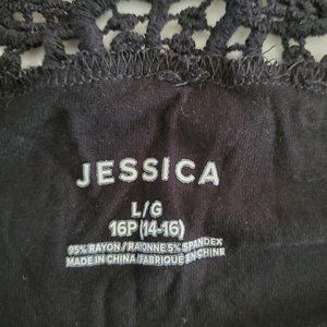 Jessica Black T-Shirt with Lace Detail on Back and Shoulders. Body of tshirt is 95% Rayon and 5% Spandex. Lace 100% Cotton. Nice quality shirt. 16P (14-16).