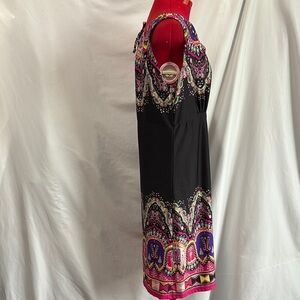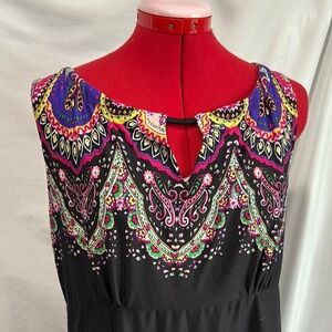 Chic midi dress with a black base and vibrant pink paisley design. Sleeveless and stylish for any event.