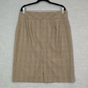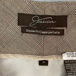Jessica Dream Fit Pencil Skirt. Women's tag size 14. Polyester, rayon, spandex blend. Fully lined. Tan glencheck pattern. Zipper, button front. Slit in back. Business office attire.