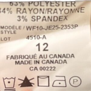 Polyester, rayon and spandex blend material has a bit of stretch, resist wrinkles and feels nice on the skin
