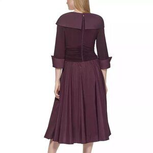 This stunning purple dress features a notched collar and a flattering fit and flare silhouette, perfect for cocktail events. The ruched detailing at the waist adds a touch of elegance, while the 3/4 cuffed sleeves provide a sophisticated finish. Ideal for making a statement as a wedding guest. The first 2 pics are for reference only to show how the item looks on a modal, the rest are actual pics of this dress. Has stretch.