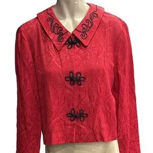 Stylish red jacket with intricate black embroidery and unique button design. Perfect for adding a pop of color to any outfit.