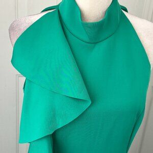 Step into the spotlight with this vivid jade green dress from Jessica Howard. Designed for the daring, this sheath-style stunner features a cascading ruffle that flows from shoulder to hem, adding a lavish, unforgettable flair. The sleeveless, cut-in arms give it a sultry halter look, while the bold standup collar and knee-length hem create a column of striking style.