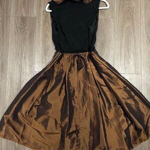 Black dress with metallic brown skirt and ruffles. Zips on the side and length 42.5 inches.