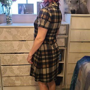 Plaid knee length shift dress with cowl neck and slightly puffed short sleeves. Tag says size small, but fits more like a medium.
