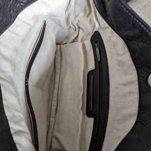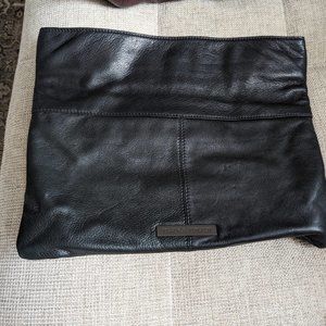 Pristine condition, black leather clutch. Ivory linen interior. 12x14