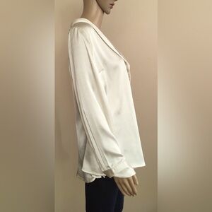 Cream Colored Wrap Blouse with Plunging Neckline and Rounded Collar. Button Closure on both sides of garment. (6 inside & 6 outside) Button Sleeve. Extra button sewn inside