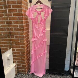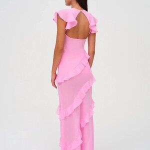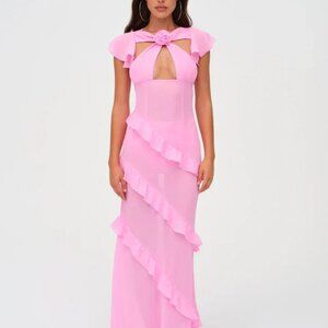 Make hearts flutter this spring in the Jessica pink maxi dress, featuring ruffled flounce sleeves, cutouts at the front, and a decorative rosette—plus elegant diagonal ruffle seams at the skirt. She'll make the perfect wedding guest dress.