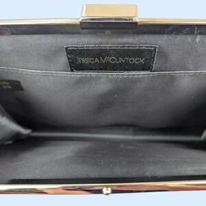 This contemporary purse by Jessica McClintock is made of faux snakeskin (which looks like cheetah print) and black (possibly faux) leather. The purse is mid-sized but very narrow and I believe the chain strap can be put inside to convert the purse into a clutch. It has a closure in silver tone metal at the top and inside there is an inner pocket that has the maker's name stitched on. This purse is in good condition, but it does have some tone loss on the bottom (see last 2 pictures) and one bite near the bottom edge. Otherwise, the purse only has normal wear.