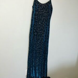 Jessica McClintock Gunne Sax Floral Blue Silver Iridescent Maxi Slip Dress