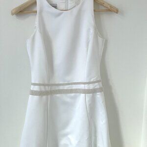 The dress has a fitted bodice with a scoop or bateau neckline and a clean, slightly flared or A-line skirt.